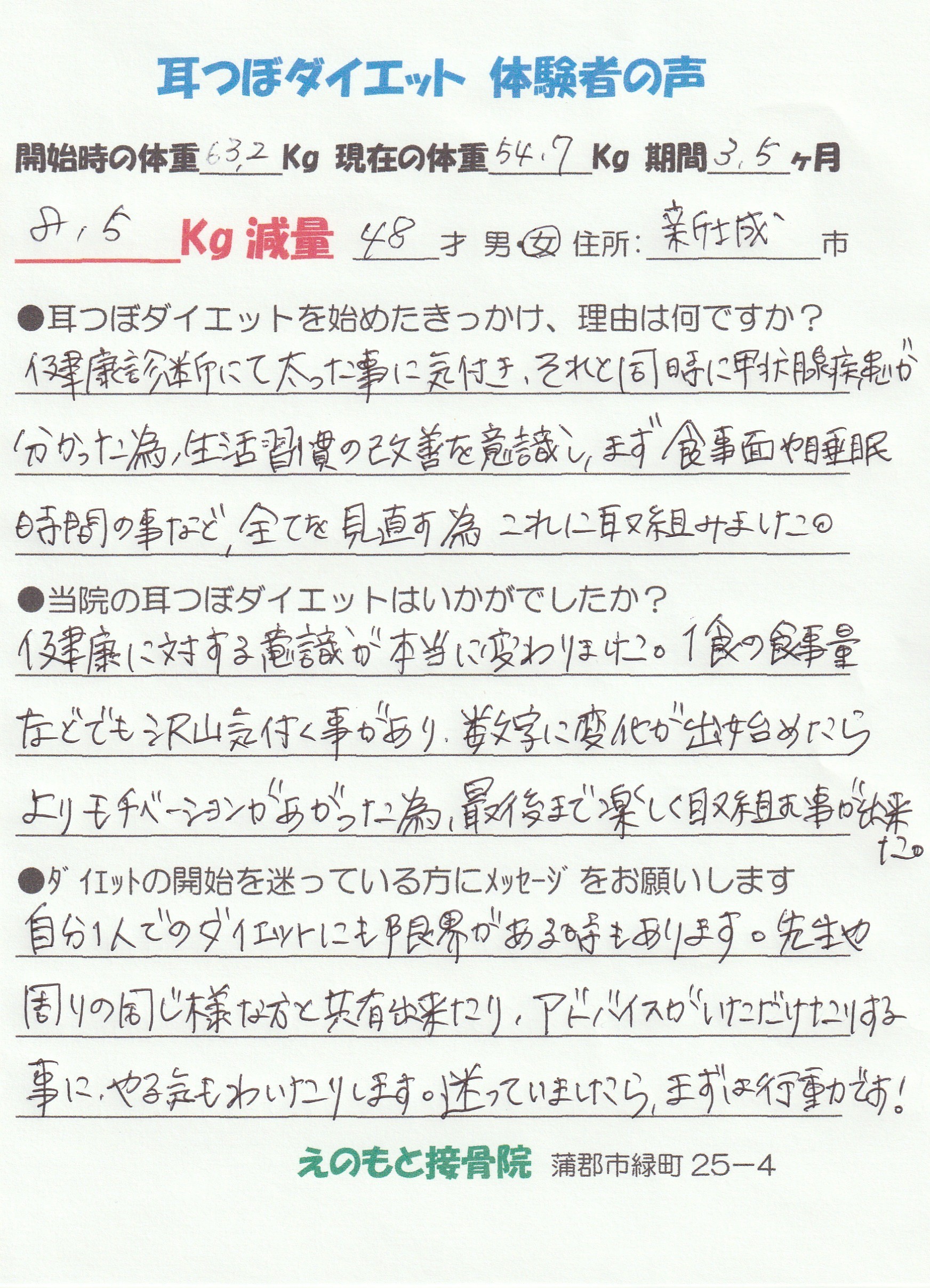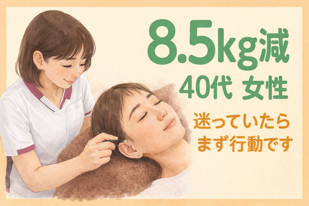 耳つぼのおかげで、ストレスなく減量することができました。
